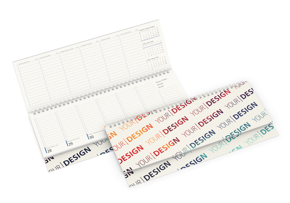 • Kalendarium: Deutsch 3sprachig D/GB/F; je Woche 2 Seiten; Stundeneinteilung von 8 bis 20 Uhr auf dem unteren Blatt; Notizraum und 3-Monats-Übersicht auf dem oberen Blatt; Informationsteil