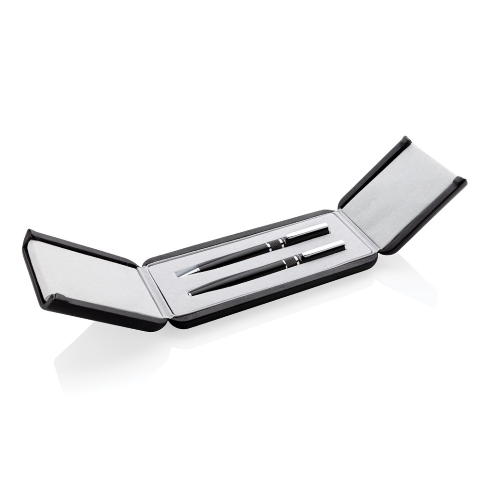 Ein wahrhaft edles Stifteset bestehend aus einem Kugelschreiber und einem Tintenroller in einer wunderschönen Geschenkverpackung mit geprägtem Logo. Beide Stifte haben eine blauschreibende Dokumentalmine für bis zu 1.200m. Der Kugelschreiber einen TC-Ball für besonders sanftes Schreiben.