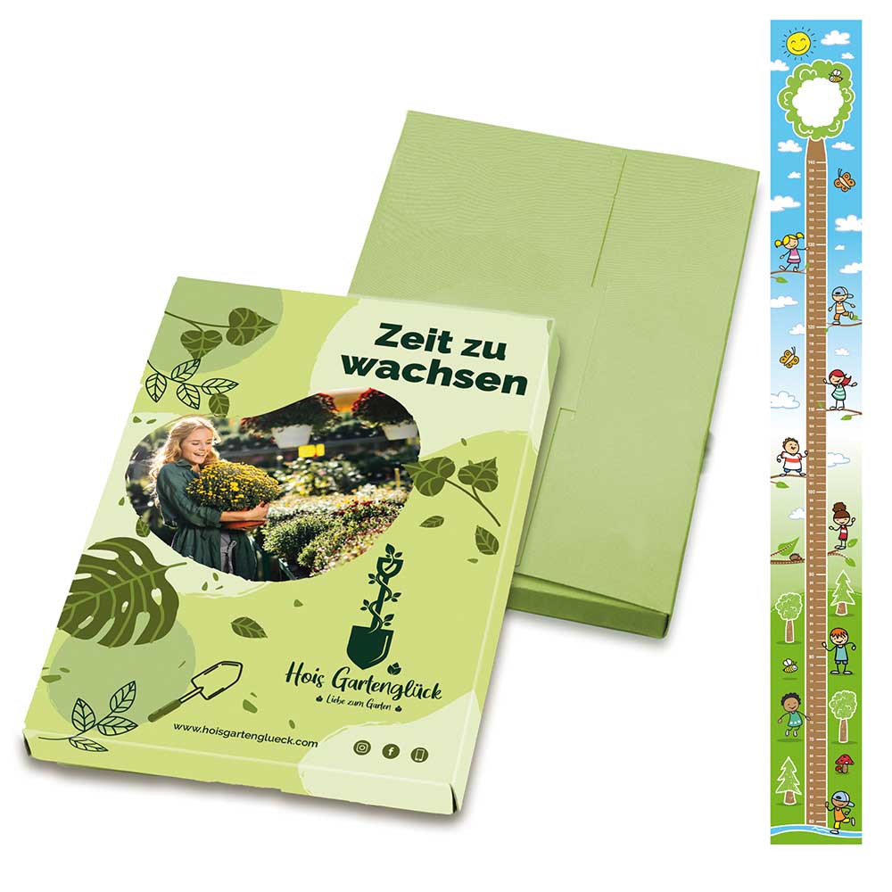 Mit der Kindermesslatte aus bunt bedrucktem Karton können Eltern auf eine einfache Weise das Wachstum ihrer Kinder dokumentieren. Der Messbereich reicht von 60 bis 140 cm und bietet somit eine lange Nutzbarkeit. Die Messlatte ist im handlichen DIN A6-Format gefaltet und lässt sich praktisch verstauen. Das Set wird in einer hochwertig gestalteten Mappe geliefert. Die Varianten: • Standardausführung: Ab Lager lieferbar, optional mit zusätzlichem Logoeindruck. • Individuelle Gestaltung: Ab 500 Stück mit personalisierter Mappe für ein einzigartiges Design.