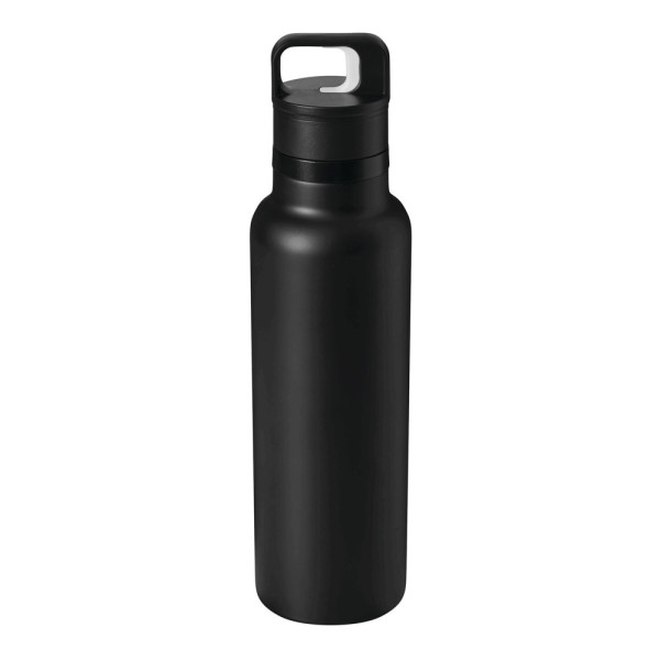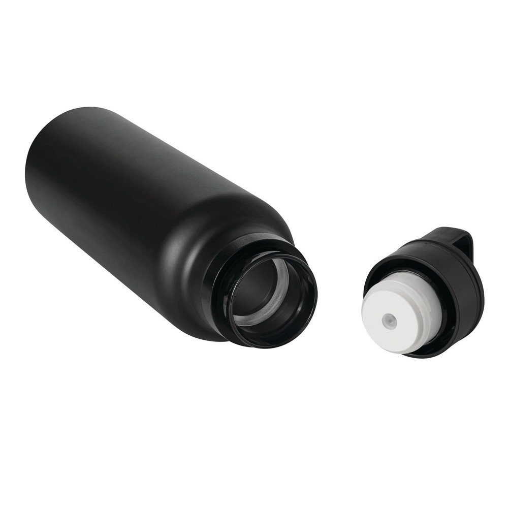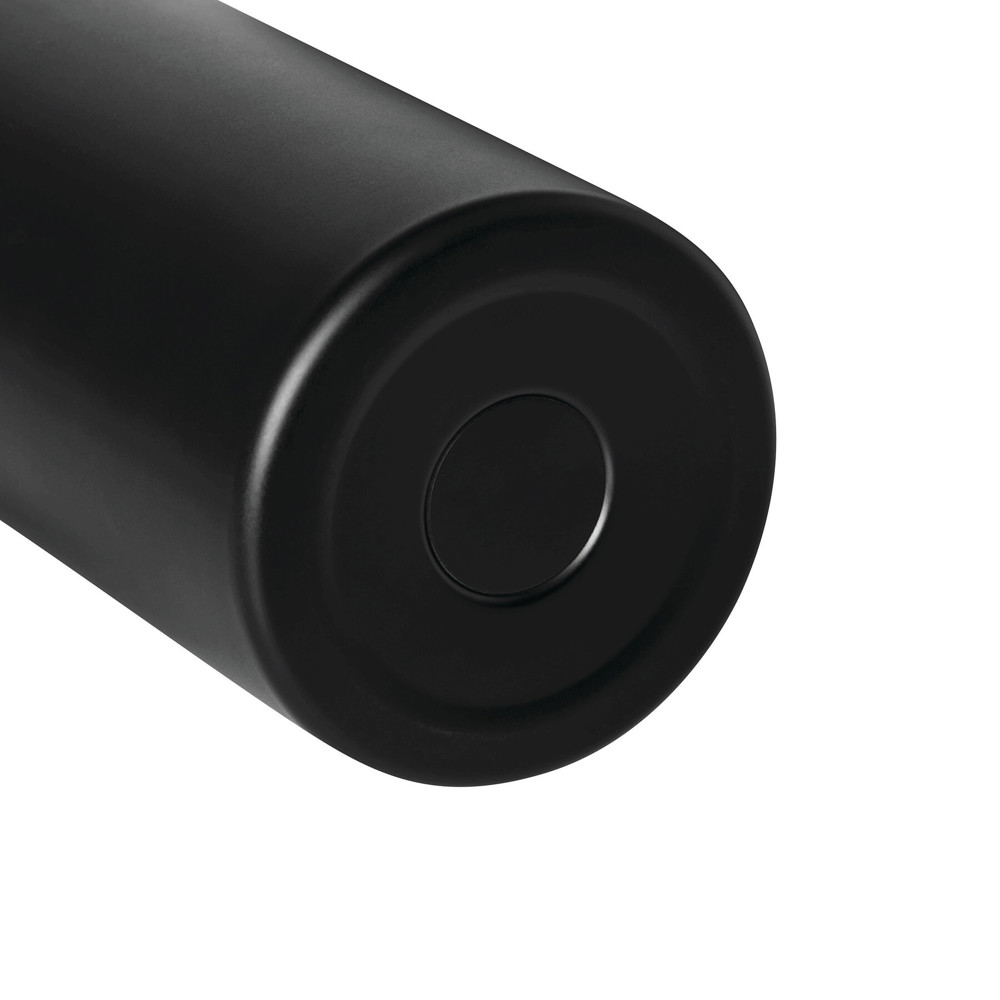 Vakuum-Isolierflasche TRAVELCLICK, doppelwandig: innen und außen aus Edelstahl, schwarzer Kunststoff-Deckel mit Einhand-Klickverschluss, Silikon-Dichtring und Tragegriff, Füllmenge ca. 750 ml, hält ca. 8 Stunden warm und bis zu 12 Stunden kalt, in Box