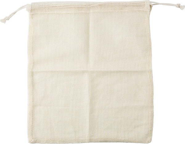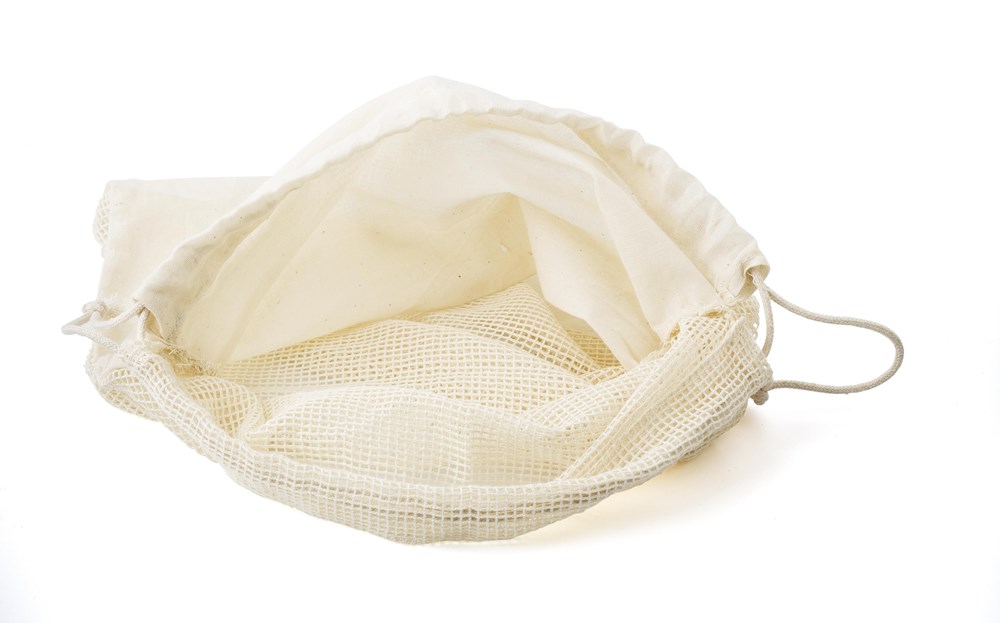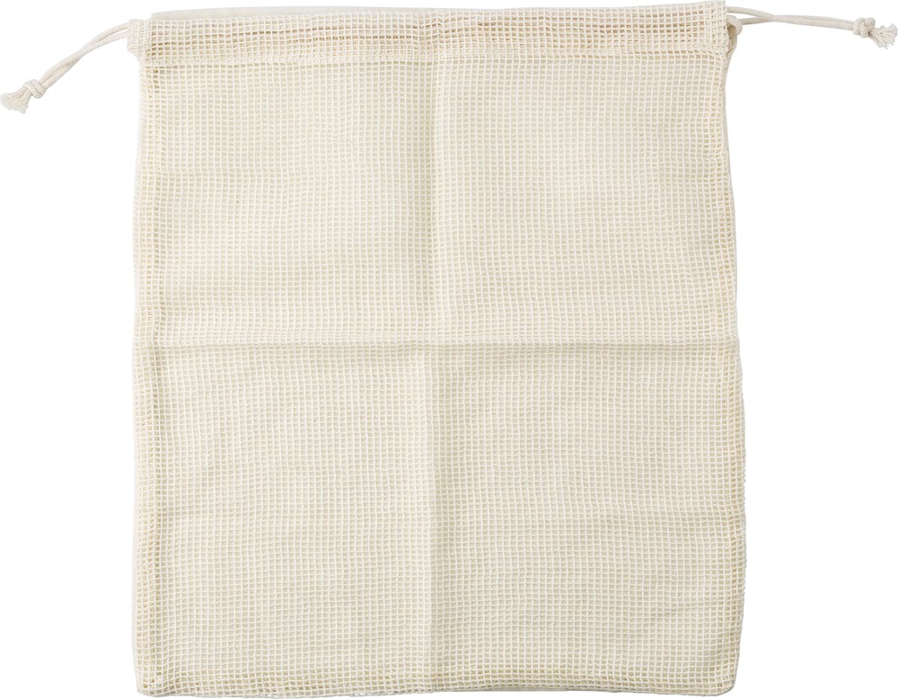 Obst- und Gemüsebeutel aus 100% Bio-Baumwolle mit einseitigem Netzgewebe und Kordelzugverschluss.