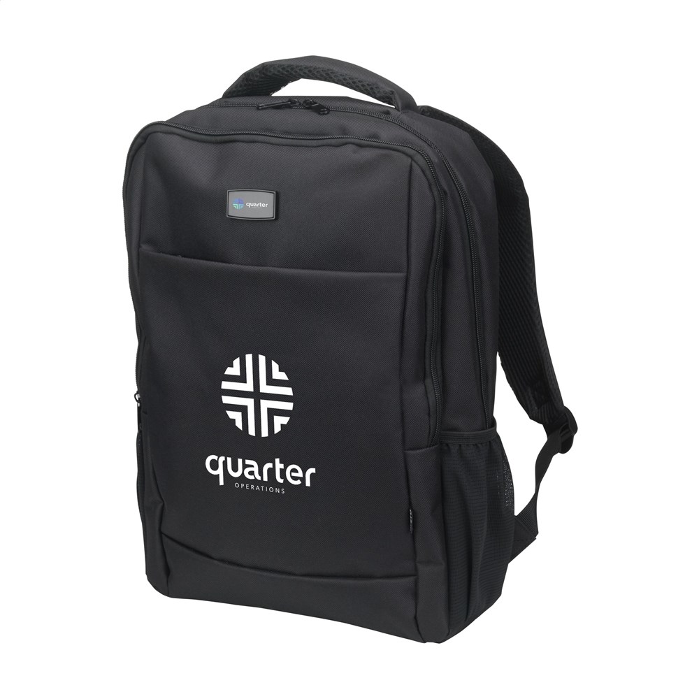 Solider Rucksack aus robustem RPET-Polyester. Mit 2 großzügigen Fächern. Das erste Fach bietet viel Platz und mehrere Taschen zur übersichtlichen Organisation von Zubehör. Das zweite Fach hat ein Schaumstoff-Schutzfach für den sicheren Transport eines Laptops bis 15,6 Zoll. Mit einer zusätzlichen Reißverschlusstasche auf der Vorderseite und einer Netztasche auf beiden Seiten. Die verstellbaren Schultergurte, das Rückenteil und der Tragegriff sind mit Netzstoff gepolstert und mit Schaumstoff für zusätzlichen Tragekomfort ausgestattet. Mit zusätzlicher Schlaufe zum Befestigen des Rucksacks an einem Trolley, robusten Reißverschlüssen, vollständig gefüttert und sauber verarbeitet. Ein Luxus-Rucksack mit vielen Extras. GRS-zertifiziert. Gesamtes recyceltes Material: 90%. Fassungsvermögen ca. 12 Liter.