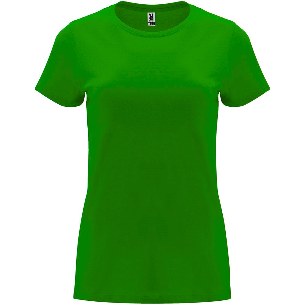 Tailliertes kurzärmeliges T-Shirt für Damen. Rundhalsausschnitt mit 1×1 Rippstrick. Verstärkte und verdeckte Nähte am Kragen. Herausnehmbares Etikett.
